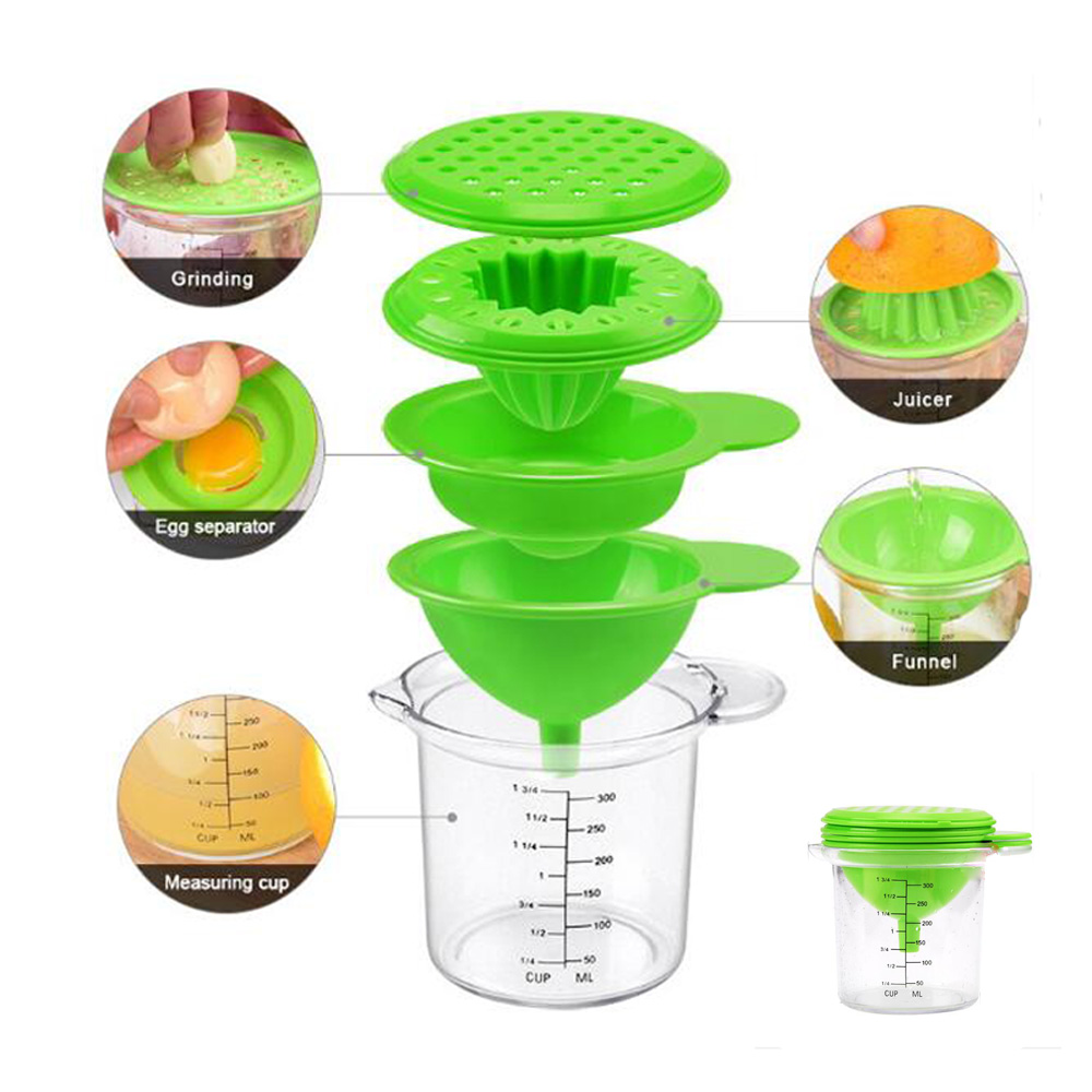 Kitchen gadgets 5 in 1 maker dimension, it is space-efficient for you to store in the kitchen. No more mess in your kitchen. Comes with 5 functional tools, fruit squeezer, egg separator, cheese grater, funnel and cup stacked together. These small tools are very important and useful in kitchen whatever you are cooking, and will bring more convenience and fun to you when cooking.