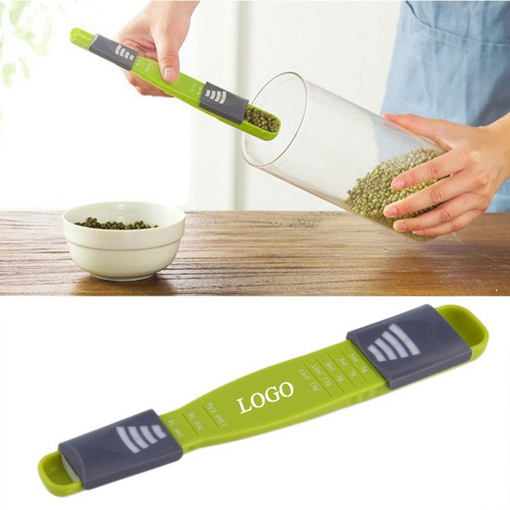 Kitchen adjustable measuring spoon is a great item for all your kitchen cooking needs. Accurately measure small amounts of wet or dry ingredients with this 8-in-1 measuring spoon. It's so easy to use: just slide the adjuster to your desired amount and scoop or pour your ingredient for a precise measurement. Grooved thumbprints help you move the sliders back and forth for accurate measuring. Perfect for baking, with precise measurements for yeast, baking soda and other dry ingredients. Your LOGO or artwork can be imprinted on it.