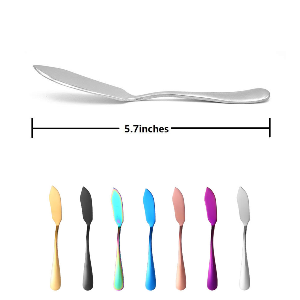 Made from stainless steel with high polish finish. Stylish blends slender necks with flared handles and faceted tips. Feature a curved edge that flows to a pointed tip. Perfect to cut and serve cheese, or use for dips or breakfast spreads, party platters and more; Also great for mustard, jam and soft cheeses. Dishwasher safe. Can simply be rinsed after use. However, hand washing recommended. Available in 2 shapes and multiple colors, each color has different price, the price on the website is based on silver products. Size: 6" x 0.6".