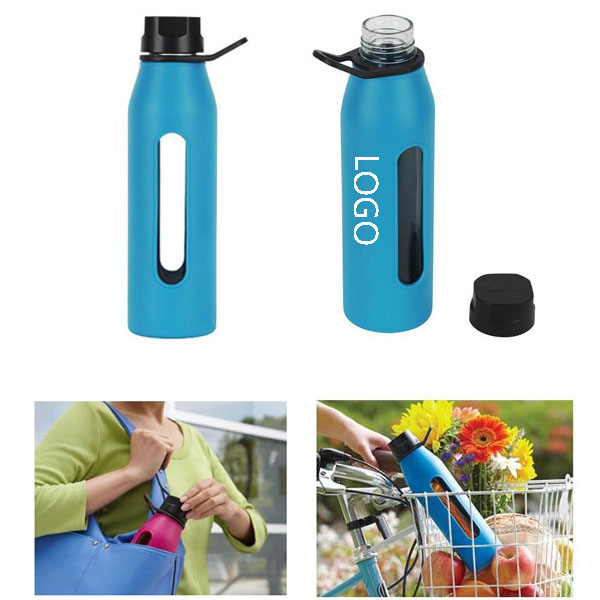 This classic water bottle features a high quality glass bottle with a wide mouth and is encapsulated by a silicone jacket that provides a nice grip, as well as protection for the bottle. Smooth, lead-free glass makes for a safe, comfortable drinking lip and a beautiful weight balance in your hand. A see-through window lets you know what is inside and how much. Now, take your favorite iced tea or water on the go with this bottle.