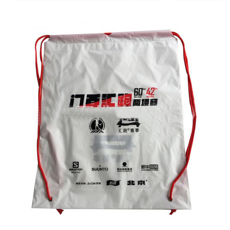 Custom recyclable drawstring backpack, made from double plastic layers. Backpack cinch design. Size is width 13 1/2" x height 18". Suit for household, shoe bag, laundry, tablet PC, toy, wash bag, or other use. Custom size is available.