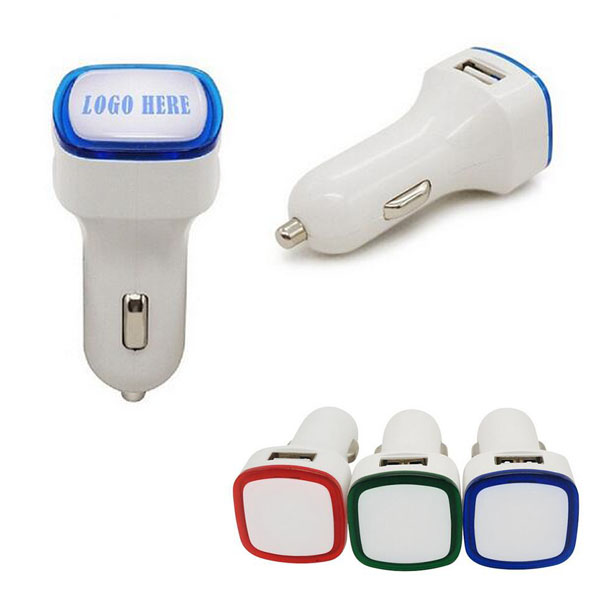 The circular soft LED light to create convenient for you to pull and plug USB cable in dim light, and allow you pull out this car adapter from car power outlet more easy. Intelligent circuit design protects against short circuiting, over-heating, over-current, and over-charging. Dual USB can charge up 2 mobile devices at the same time when you are on driving (Include: Smart phones, tablets, music players, digital cameras, kindle, power banks, GPS, dashboard camera, bluetooth speaker, and all other digital devices). Each USB port has 2.4A max output. Certified by RoHS, CE, and FCC. Your design can be epoxy imprinted on the upside of the charger.