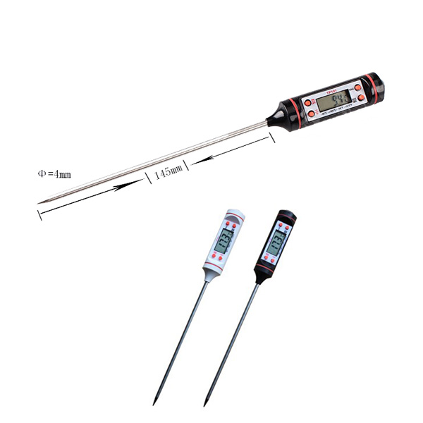 Digital BBQ Thermometer or food thermometer. Your great partner when go camping or picnic, suit to test the temperature of milk, bathtub water, experiment items and so on. Switch between F-Fahrenheit and C-Celsius. Temperature range (F: -58 to +572 or C: -50 to + 300). Memory of last measuring. Saving power: auto-off after 10 minutes of no-operation. Made from ABS and stainless steel. Size is 9.0"x0.78".