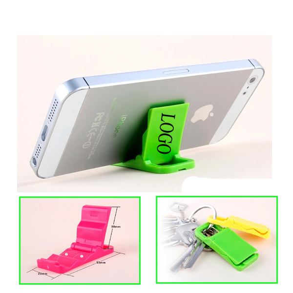 This mini phone holder is made from ABS, size is 2"x0.9". Open it and put your phone on it. You can adjust your phone's position on two angles. Come with a key holder, convenience and portable design. Your customized LOGO can be imprinted on the outside. Many colors for your option.
