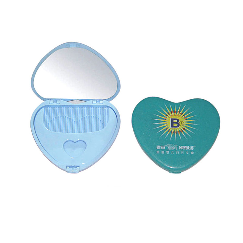 Heart shape mirror with mini comb inside. Made from plastic and glass. Compact design, size is 3 3/8x3", suit for your pocket and handy bags. Ideal for daily use, travel, student, office, salon and beauty business etc. Your LOGO can be imprinted on the outside of mirror.