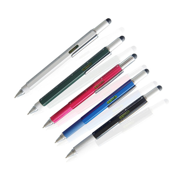 Made of metal, this solid colored 4-in-1 stylus pen features a soft rubber stylus on the end of the pen for smudge-free touch screen use. Write smoothly with ballpoint pen. Crosshead and flat head screwdrivers , Spirit level, Ruler in cm and inch. The barrel and tip of the pen is available in a variety of colors. A pen clip lets you keep this handy pen on your person at all times.