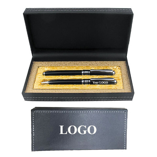 High Quality Pen Set, including one roller point pen, one ballpoint pen, and one gift case. Both pens are made of steel and copper. Handsome rich enamel black and shiny chrome silver finish. Your LOGO can be laser engraved or silkscreen imprinted on the pens, or silkscreen imprinted on the outside of gift case.