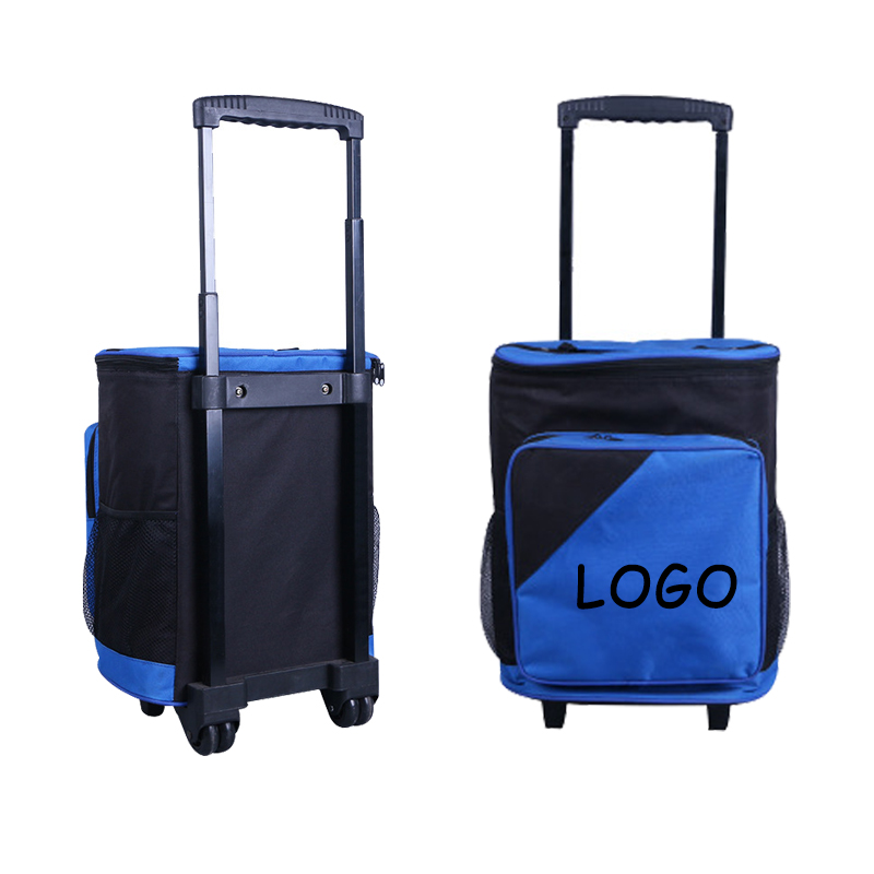 Cooler with wheels, a strength- saving cooler, made from 600D oxford and aluminum film. Perfect items that do not need to be kept cold and warm. Mesh pocket keeps napkins and other small items in place. Your customized logo can be imprinted on it.