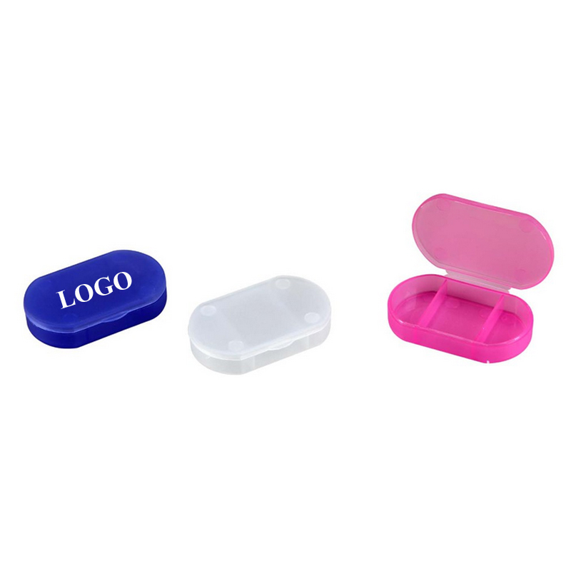 This pill shaped pill box is made from food grade plastic material. Size is 2 3/8"x1 1/2"x1/2", have three compartments. This product is a great choice for health insurance companies, doctor offices, pharmaceutical companies and other health-related companies or events.