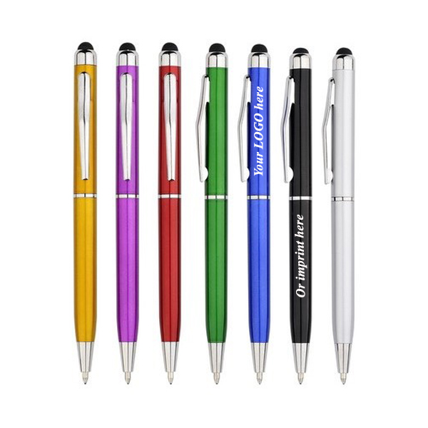 Twist stylus screen touch pen, made from plastic. Length 5 1/4". Slim body design. New hotest touch pen ! Twist the pen body to release the ballpoint pen. Many colors for your option. Great promotional item for any events or activities. Convenient cell phone accessory that you can use with all kinds of touch screen phones or tablets.
