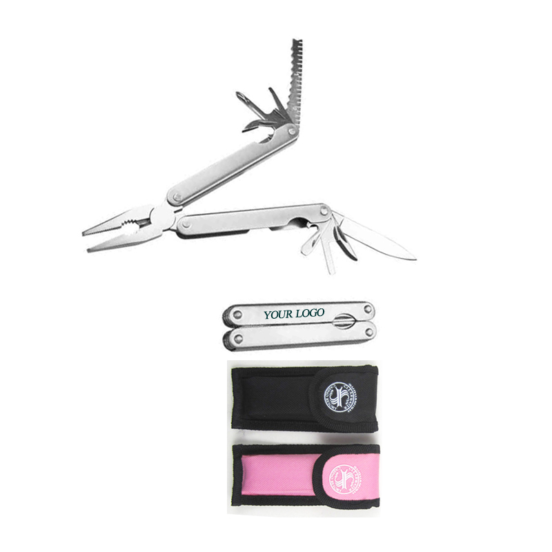 Get this tool kit, you will be a great handyman. This Stainless steel pliers kit includes blade, bottle opener, pliers, screwdriver, file and saw. It can meet an array of needs. LOGO can be laser engraved on the pliers handle. Each packed in one opp bag and nylon pouch.