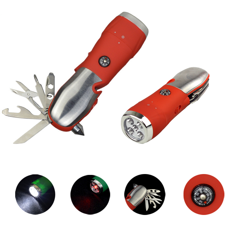 This new item satety hammer tools flashlight will bring new business for you. 4 white lights with red flashing light, Multi-tools includs mini compass, hexagonal screwdriver, phillips screwdriver, scissor, bottle opener, fruit knife, safety hammer, safety belt cutter, this is a 11 in 1 tools. Perfect for camping, outdoor activities, and some emergencies. Welcome your logo to imprint on it.