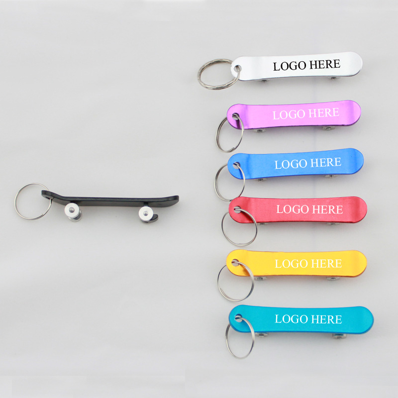 Skateboard shaped bottle opener with keychain, made from aluminum alloy, length is 5". Many colors for your option, your LOGO can be laser engraved. We have dozens of shapes for your option. Please contact us for inquiry.