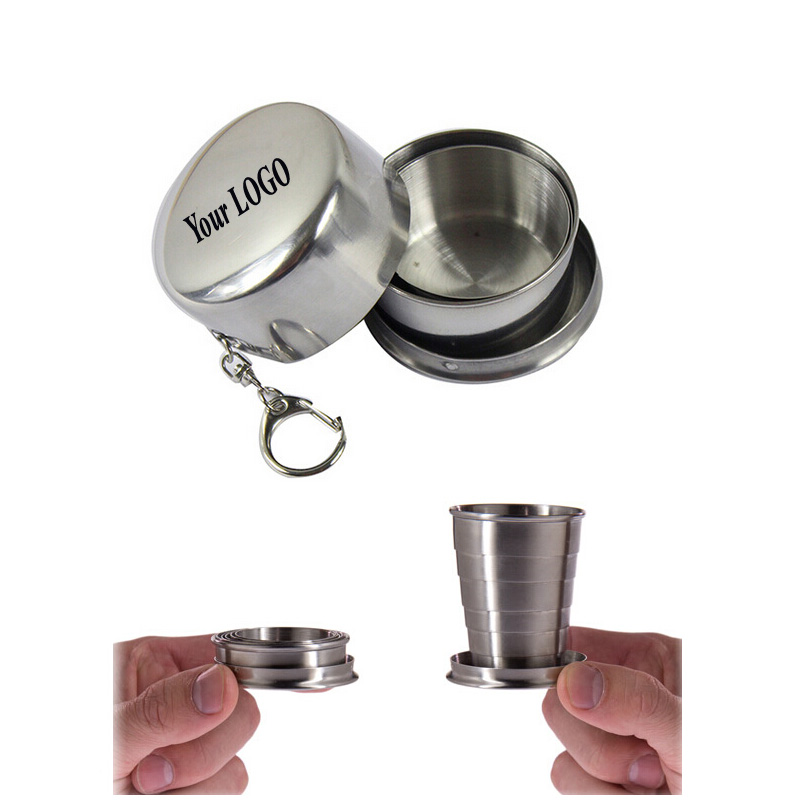 Collapsible stainless steel shot glass with keychain, made from 100% food grade material. Mini size and portable. Three volume for your option: 2 OZ, 5 OZ, and 8 OZ. Great partner for outdoor and travel. Your customized logo can be laser engraved or silk screen imprinted.