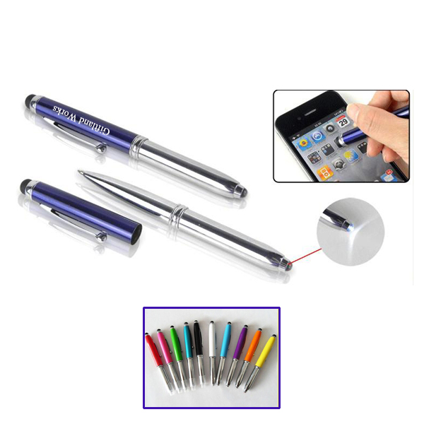 Stylus pen, made from copper and steel. Three functions in one. Length is 4.7". One side is capacitive stylus, suit for smartphones, Tablet PC and other capacitive touch screens. The other side is Led Flashlight with batteries inserted. Control the flashlight's on and off with pressing the LED bulb. Your LOGO can be laser engraved or silkscreen imprinted. Many colors for your option.