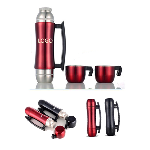 Great design for thermos ,21 oz. vacuum sealed stainless steel thermos with 2 removable drinking cup , cup is lid and lid also is cup , a handle is to be carried easily. This insulated beverage holder keeps your drinks hot or cold for when you are ready for your next cup of your favorite beverage. Due to stainless steel materials for liners and outside shell, your logo can be imprinted.
