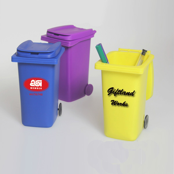 Plastic Trash Bin Pen Holder/Table Container. Made from PP material. Size is 3.8"x3.15"x5.7". Great promotional item for the theme of environmental protection. Many colors and your customized LOGO is available.