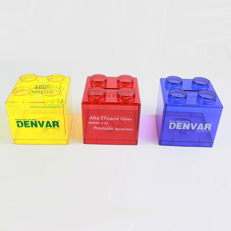This Block Bank is made from half transparent plastic, size is 3 5/8"x3 1/2"x3 1/2". Removable plug on bottom to retrieve coins. Your LOGO can be imprinted on each side except upside and bottom.