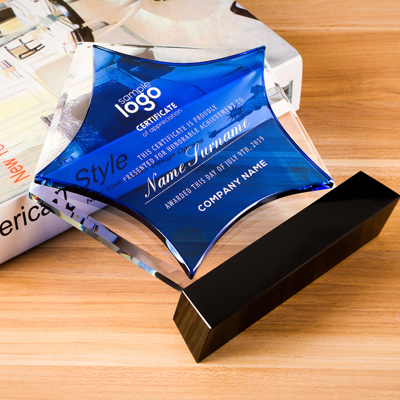 Blue Pentagram Optical Crystal Award, size 6.3"x8.3". Your commend and LOGO can be printed inside. Each packed in one gift box. Please contact us for more details.