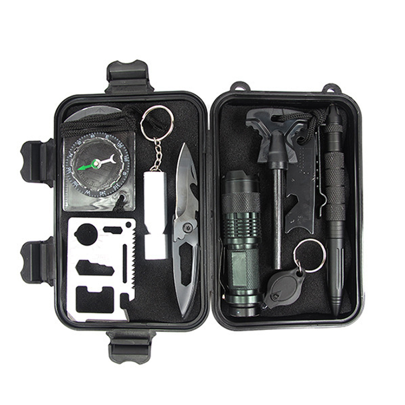 "Complete 10 in 1 emergency kit to protect you and everyone dear in every unwanted emergency situation. It includes: butterfly handle large flintstone, multi-function scraper, high frequency double hole whistle, strong light flashlight, multi-function knife, the army knife card, compass, portable key light, tungsten steel broken window defense pen, large waterproof and shockproof storage box. Sticker logo.