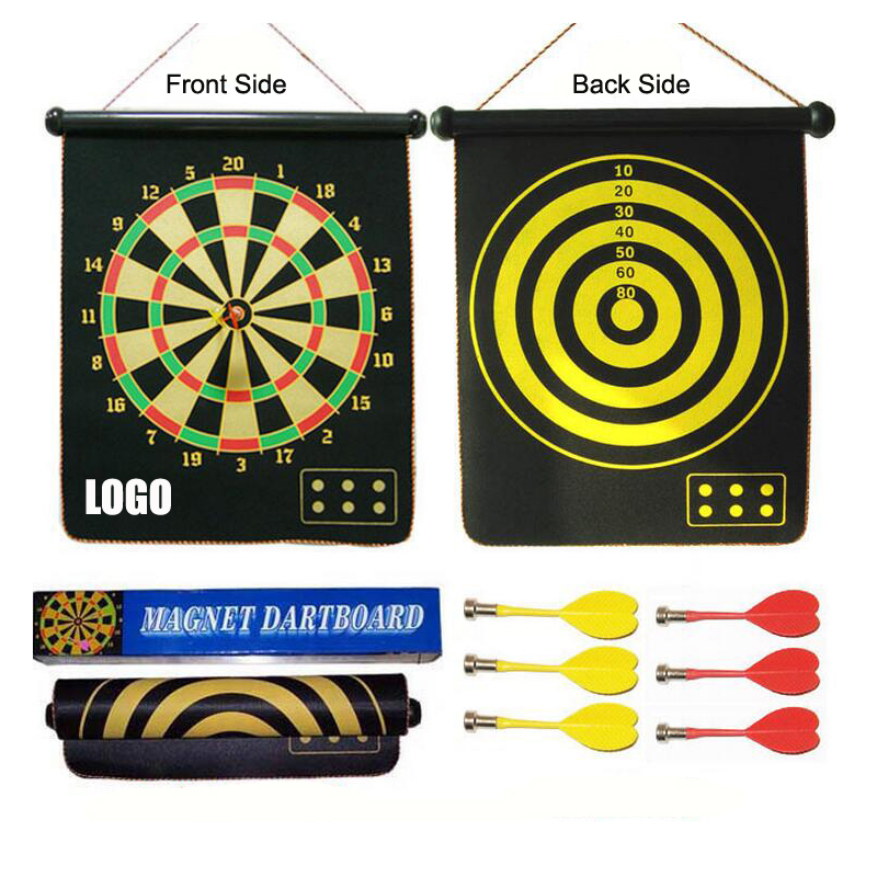 Magnetic dart board constructed of rubber steel and velvet wide variety of fun games. Safety magnetic dart board, double sides design. Colorful 15" target board. A wide variety of fun games of skill can be played using this safe, magnetic dart board set. Comes with 6 safe magnetic darts. We also provide other size for your option. Your customized logo can be imprinted on the corner.