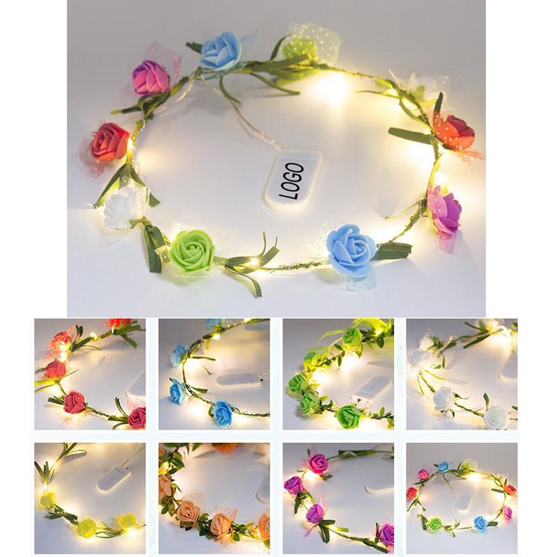 LED light up Hawaii head flower, or floral hoop. Make yourself to be fairy after wear it on the party or other night activities. Comes in 10 flowers and 10 LED lights. We can make different flowers color and lights color assorted as your request. Your customized logo can be imprinted on the outside of battery case.