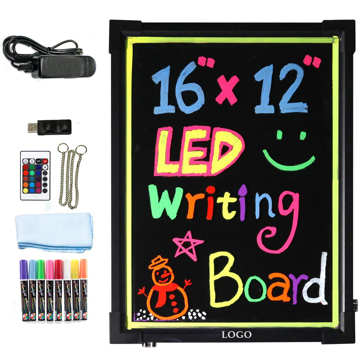 USB Port/Socket connector enables for both OUTDOOR and INDOOR usages. Energy-saving, environmentally-friendly, durable and long-lasting. Large firm writing area for unlimited creative choices. Then write on this neon lighted LED board and wipe off - Also lightweight and easy to carry around and set up. Perfect for restaurant, club, bar, cafe menu sign, daily specials, promotions, special events, discount sales, or price lists. This board will come with an external AC Adapter power cord, an extension cord, 8 liquid chalk pens, a remote control, a hanging chain and a soft & gentle wiping cloth. The board includes 16 different colors and 4 various flashing modes - The brightness can also be adjusted to your liking. Perfect for spicing up your decoration, add welcome feelings and attract more visitors to your party, restaurant, retails shops and etc. This writing board has several sizes: 12"x16", 16"x24", 20"x28" and 24"x32". The price is based on 12"x16".