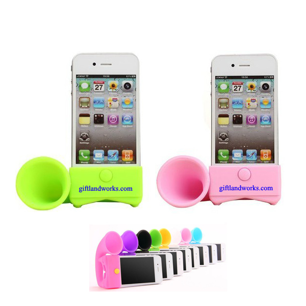 This lovely phone loudspeaker, is made from silicone. Suit for Iphone 4 or 4 S. Without electric drive, put your Iphone on it, it's not only a phone holder, but also a loudspeaker, that will make the voice louder 13 decibels. Many colors and your customized LOGO is available.