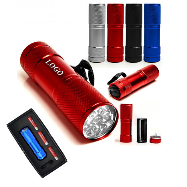 Pocket LED flashlight kit, with 3 AAA batteries. Packed in one gift box. Flashlight size is 1.1"X3.5". Your best partner in darkness. Lightweight and super bright with 9 LED bulbs. Many colors for your option. Your customized LOGO can be laser engraved on the flashlight or silkscreen imprinted on the outside of gift box.
