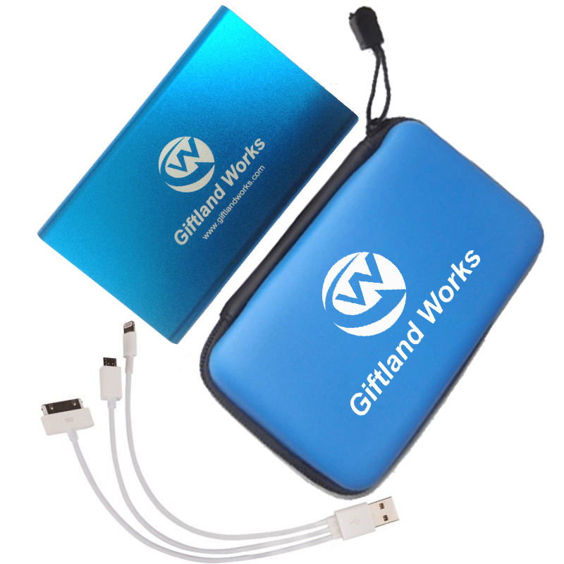 Power charger kit or power bank kit, including one super thin (thickness is only 0.39") handy polymer power bank with volume 4,000 mAh, one 3 in one cable (Can charge I5, I6, Samsung phones and so on), and EVA foam case. Case size is 5.1"x3.5"x1.57". Cute and portable. Your best partner when travel outside. Your customized LOGO can be imprinted on the outside of EVA case or on the outside of power charger.