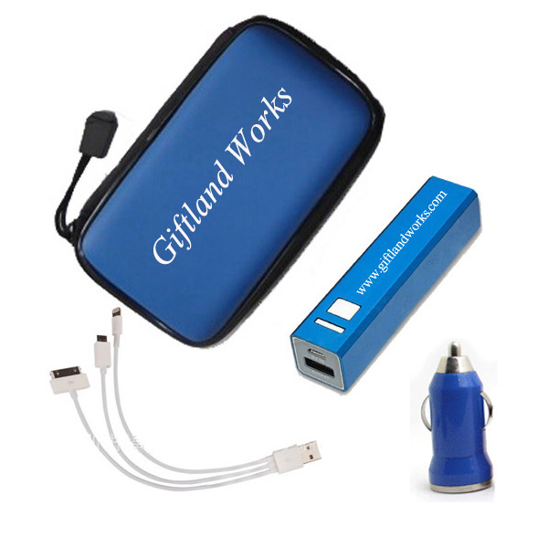 Power charger kit or power bank kit, including one aluminum power bank with volume 2,000 mAh, one 3 in one cable (Can charge I5, I6, Samsung phones and so on), one car charge and one EVA foam case. Case size is 5.1"x3.15"x1.57". Cute and portable. Your best partner when travel outside. Your customized LOGO can be imprinted on the EVA case or on the power charger.