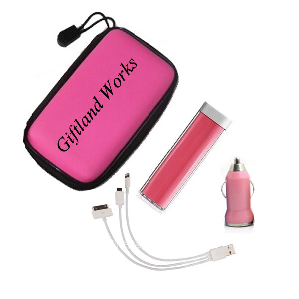 Power charger kit or power bank kit, including one lipstick shaped power bank with volume 2,000 mAh, one 3 in one cable (Can charge I5, I6, Samsung phones and so on), one car charger and one EVA foam case. Case size is 5.1"x3.15"x1.57". Cute and portable. Your best partner when travel outside. Your customized LOGO can be imprinted on the EVA case or on the power charger.