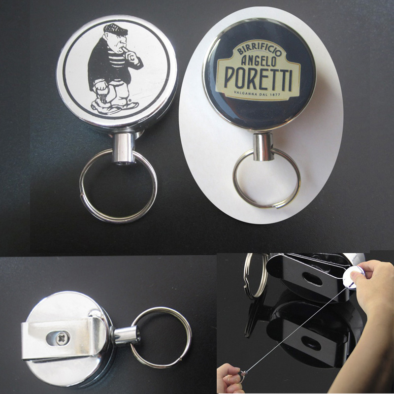Metal Retractable badge reel with a 27 1/2" cord extension. Made from high quality steel. Have a metal clip on the backside. Your LOGO can be silkscreen imprinted or epoxy printed. Great item for exhibition, conference, party and other business activities.
