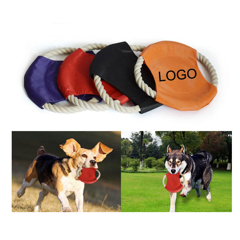 Dog flyer and rope toy, made of cotton rope with polyester center/ imprint panel. 7" Diameter. Great for playing rope tug or fetch. The pet disc is very strong, it can support most dog's bite force. The flexible material can avoid your pet injured. Enjoy the game with your baby!