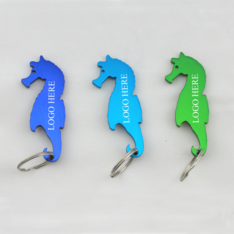 Sea horse shaped bottle opener with keychain, made from aluminum alloy, length is 3.0". Many colors for your option, your LOGO can be laser engraved. We have dozens of shapes for your option. Please contact us for inquiry.