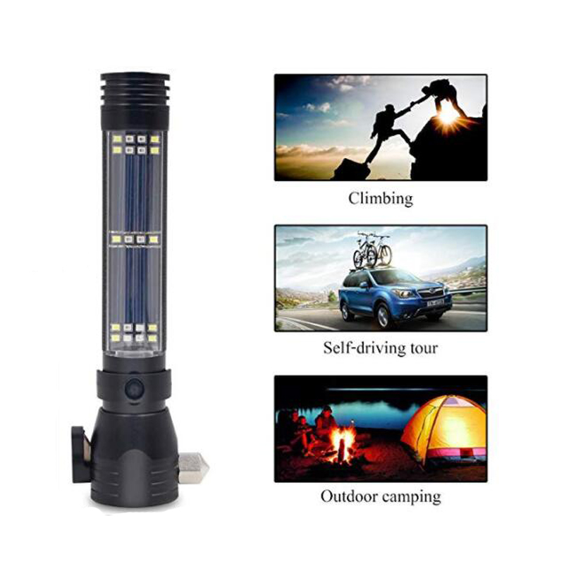 | Feature : | Solar Powered USB Rechargeable Tactical LED Flashlight With Safety Hammer Safety Cutter |