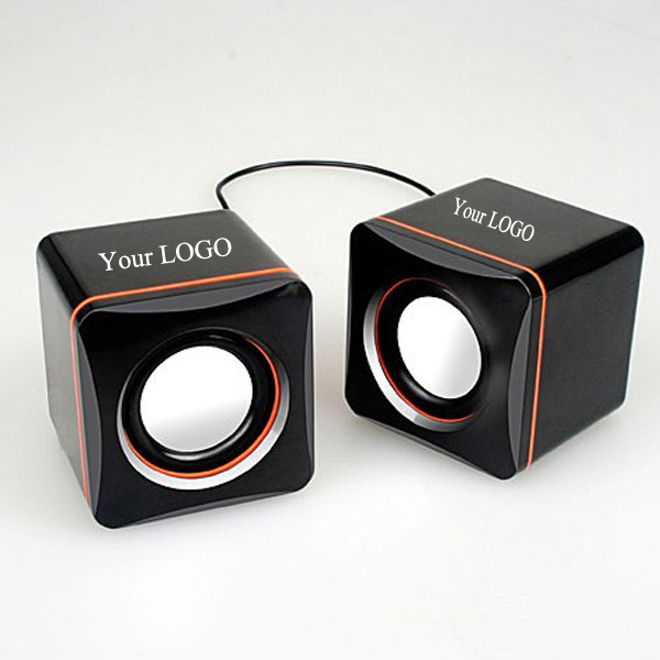 This portable speakers work with any cell phones, smartphone or MP3 device. To power the speakers, simply plug the USB power cord into a computer, USB hub or USB power charger. Size is 2.75"x2.75"x2.83". Features 5 watts and voice frequency 90HZ-20KHZ. Your customized LOGO can be imprinted on the upside.
