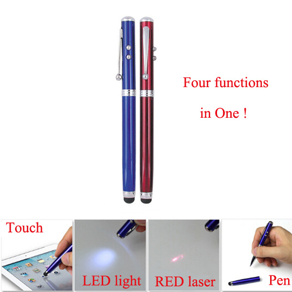 High quality stylus pen, 4 in one, made from copper, size is 5.2" length. Including one white LED flashlight, one red laser pointer, one capacitive touch tip, and ballpoint pen.Batteries included. Your LOGO can be silkscreen imprinted or laser engraved.