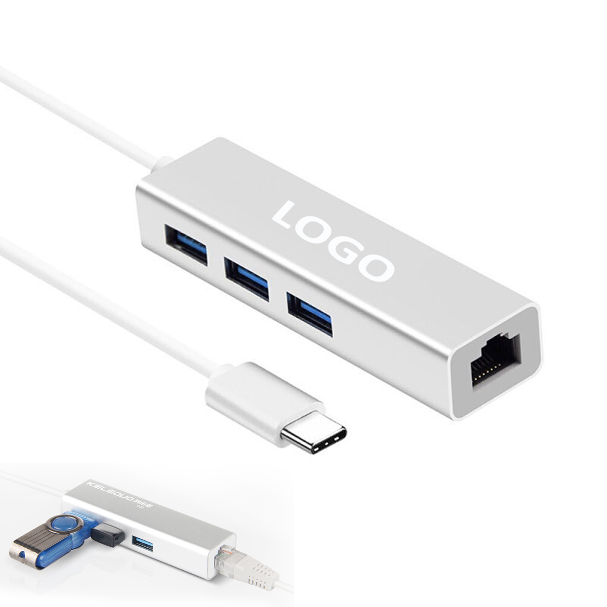 This HUB is made of aluminium alloy, 3 USB ports 1 ethernet adapter. It fits easily in bags and purses, allowing you to expand your computers capabilities while on-the-go, sleek aluminum design perfectly complements apple accessories. This HUB can give you access to superfast network speeds; automatically adapts to 10M/100M/1000Mbps network transmission. Your logo can be printed on it for promotion.