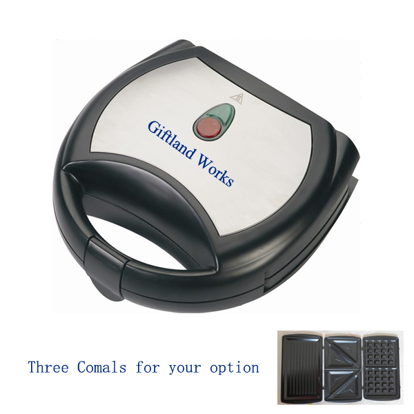 Waffle or sandwich maker, three comals for your option. Non-stick hinge and cooking surface, easy cleaning; Cool touch housing provides extra safety; Slide-resistant feet, power light and ready light; stand upright for compact storage. Your LOGO can be imprinted on the outside surface.