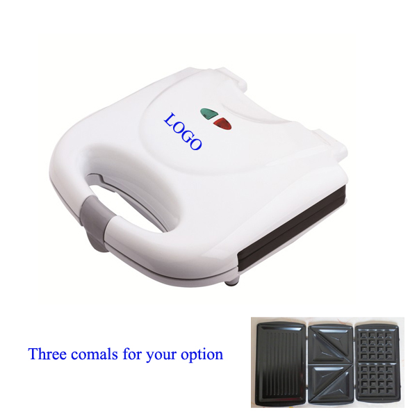 Waffle or sandwich maker, three comals for your option. Non-stick hinge and cooking surface, easy cleaning; Cool touch housing provides extra safety; Slide-resistant feet, power light and ready light; stand upright for compact storage.Your LOGO can be imprinted on the outside surface.
