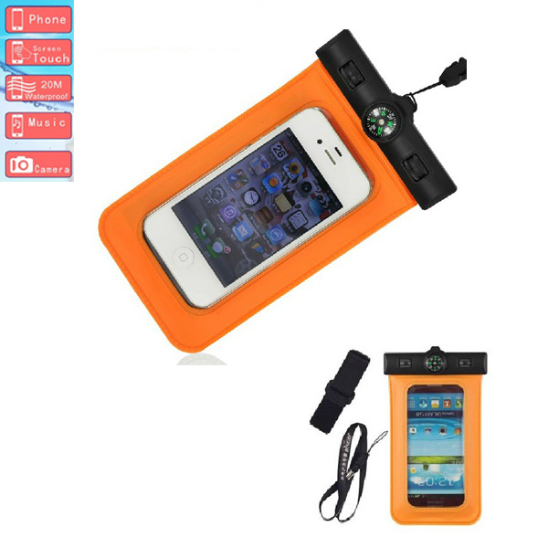 This waterproof pouch features a compass built in the clip. If you are fishing,swimming,drifting, or at the beach, this waterproof pouch will keep your cell phone or valuables safe and dry, and you won't get lost with this compass. Super lock technology securely seals out water, and the conductive material allows your capacitive touch screen to be used while your device is still in the pouch. Transparent window allows your mobilephone's camera still work under water. Fits for Apple phones, Samsung Phones and which of screen size is under 5.5 inches.